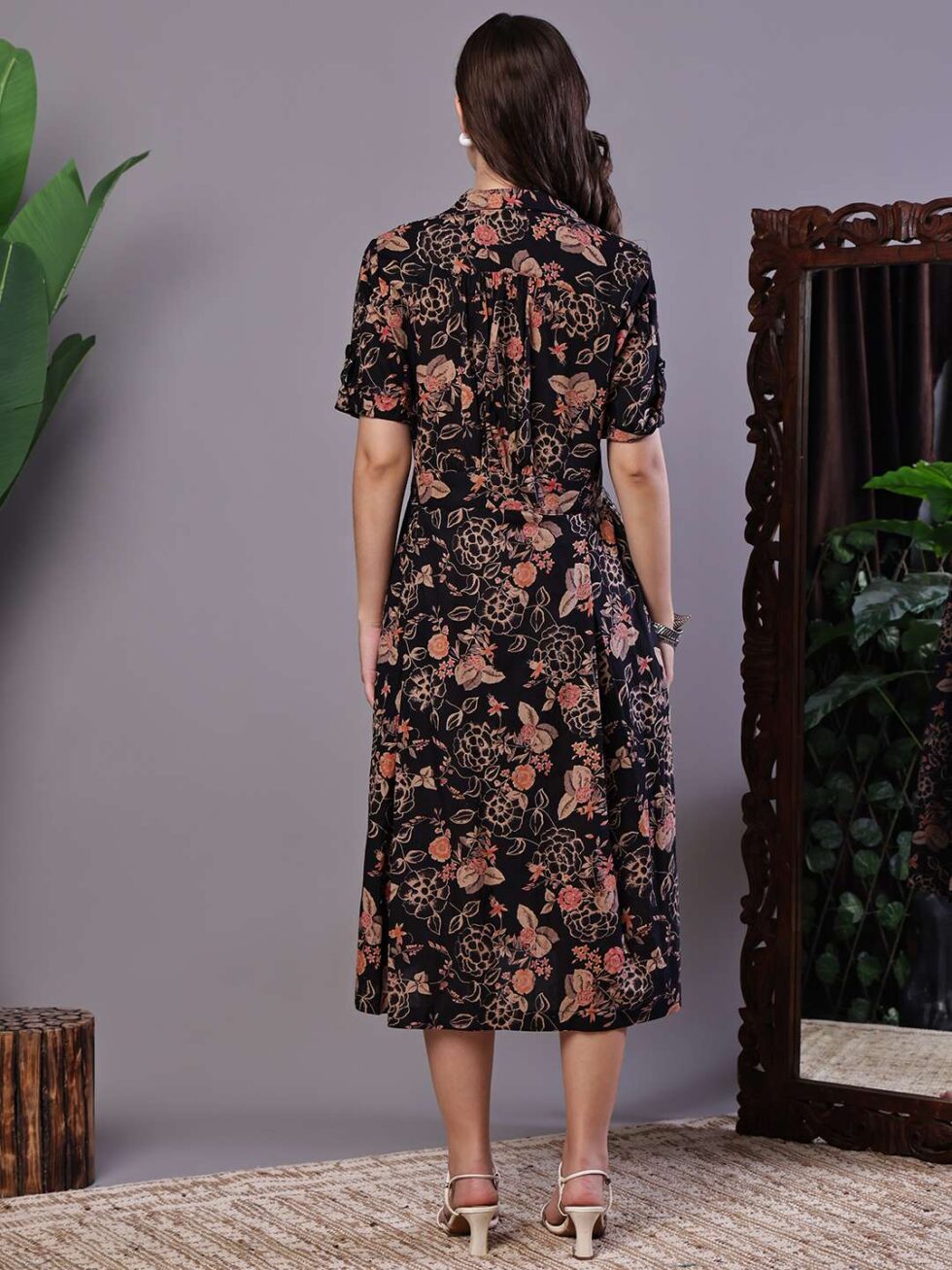 Women’s Chic Black & Rust Floral Print Button-Front Midi Dress
